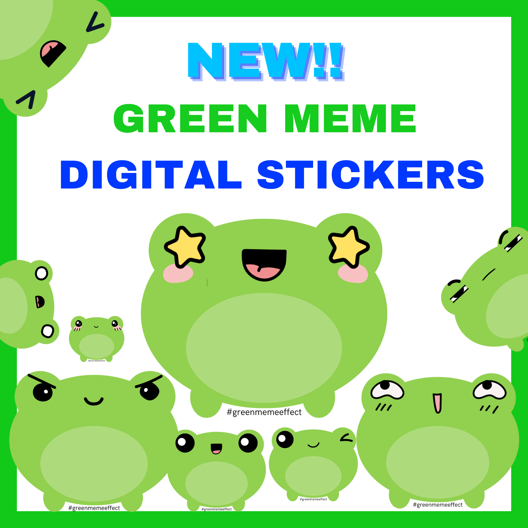 The GREEN MEME EFFECT project has developed a series of digital stickers that are available on official GIF websites such as GIPHY and TENOR in addition to the Green Meme Gallery!