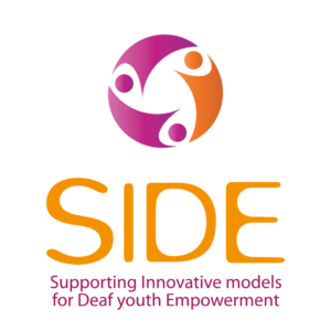 The SIDE project (Supporting Innovative models for Deaf youth Empowerment) intends to develop a blended model for learning based on visual languages for the acquisition of basic, transversal and professional competences by deaf young people that can support the transition from education to work. In order to improve employment situation for youth deaf we need educational and vocational programmes which are accessible and valorize the talents of deaf people. This approach will support creative discovery and problem based learning as well using a multiple communication approach. The project focuses on elaborating and experimenting a model for blended learning addressed to deaf youth, including “real” non formal training activities (outdoor training, coaching, Impro-theatre) and “virtual” training activities based on professional didactic modules developed through videos and sign language in a virtual learning environment.